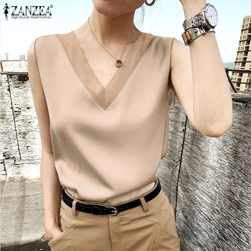 Celmia ZANZEA女式无袖缎面丝绸上衣衬衫纯色OL办公商务背心#11